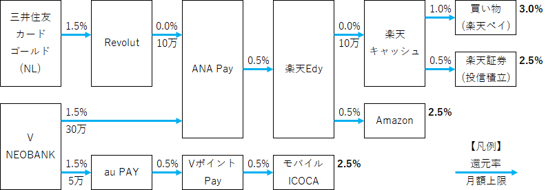三井住友カード ゴールド(NL)の100万円修行のために金融アプリ「Revolut」をインストールしました。三井住友カード ゴールド(NL)を100万円利用すると10,000ポイントがもらえるので100万円ちょうど利用すると還元率が0.5%から1.5%になります。あとはSBI証券のクレカ積立の還元率も1%になります。ポイント制度が続く限りはこんな感じでポイ活する予定です(画像)。