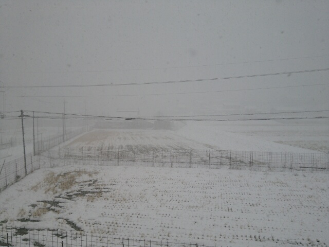 今年の正月は日本海側で天気が悪いですね。昼前から雪が降り始めたんですが、かなり吹雪いています(写真)。