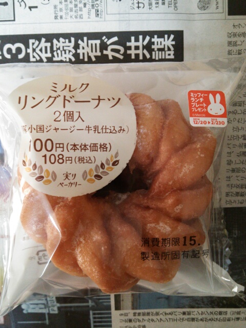 ローソンのパンがおいしいシリーズ。「ミルクリングドーナツ(写真)」にハマっています。いわゆるドーナツですが、コーヒーにすごくよく合います。2個入って108円はお得感があっていいですよね。ただカロリーは結構高いです。