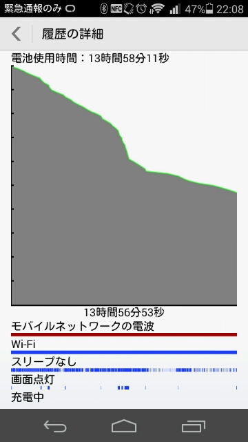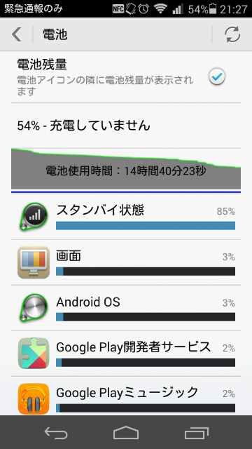 Ascend P7を平日に1日使ってみたところ電池は思いのほか持ちました(画像)。データ通信専用のSIMカードを使ったときに、音声通話用の電波を検知しようと無駄に電池を消費するセルスタンバイ問題というのがあります。スクショを見る限りスタンバイ状態が85%も消費しているように見えますが、もしそうだとしたらセルスタンバイ問題がなければどれだけ電池持ちがいいんだという話になりますし、LTE圏内だと実際は電池を消費しないという話もあるので気にしなくてもいいかなと思っています。幸い普段の生活がLTE圏内だったので特に不便なく使えています。実家に帰ったら電波入らなくなるのは確実ですけどね(笑)