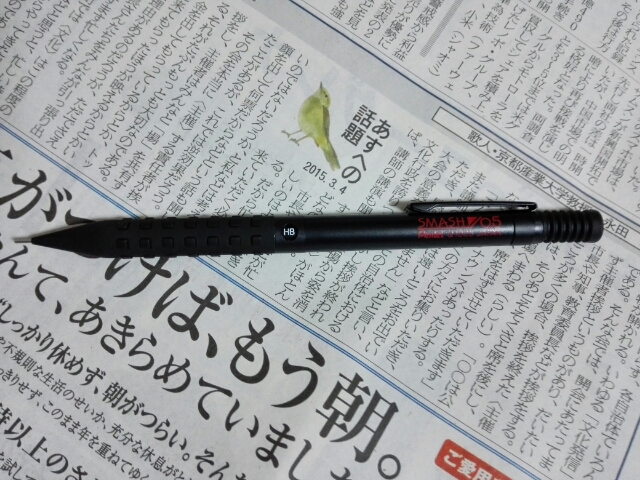 ぺんてるのスマッシュというシャープペンシルを買いました(写真)。Amazonで432件のレビューが付いているベストセラー製品で気になっていたんですよね。ちょっと書いてみた感じだと普通のシャーペンな気がしますが、明日から仕事で使ってみてどういう感想を持つかですね。これまで使っていたPILOT S3は高校の時から使っていたんですが、金属部分が結構錆びてきたので引退してもらうことにします。