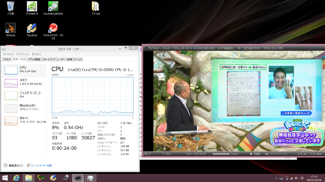 いつもは地デジチューナーを搭載したデスクトップPCでテレビを見ていますが、いろいろ設定をしてやるとLAN経由でノートPCからテレビを見ることもできました(画像)。これで離れたところでもテレビを見られますね(ワンルームだとあまり意味ないですが)。それから視聴ソフトを使うノートの方にCPU負荷がかかるので負荷分散にもなりますね。