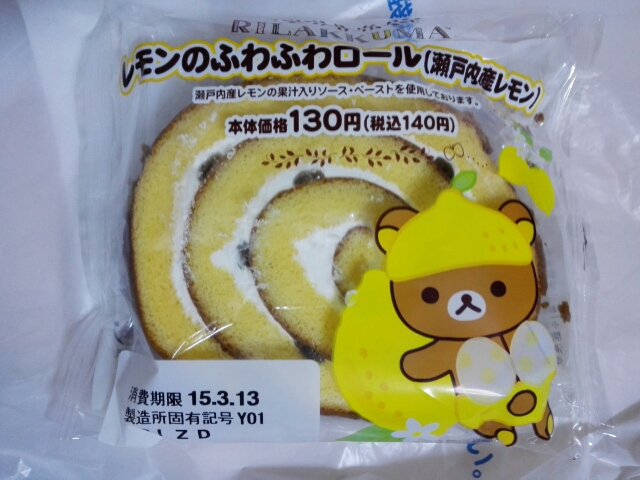 ローソンでリラックマのキャンペーンが始まってますね。先輩でシールを集めている人がいるので協力しています。今朝食べたのは「レモンのふわふわロール(瀬戸内産レモン)(写真)」です。瀬戸内産のレモン果汁入りソースの酸味がすごくおいしいんです。想像よりも酸っぱくて、酸っぱいもの好きには堪らない味ですね。レモン苦手な人にはちょっときついかもしれません。