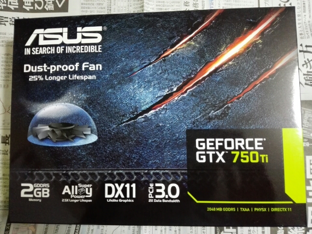 ちょこちょこパソコンのパーツを換えていっていますが、今回、新たにグラボを買いました(写真)。前回のCPU換装と合わせてPentium G3220+GTX650 → Pentium G3258+GTX750Tiとなり、私の用途ではかなり快適になります。負荷時のテレビ視聴のカクつきはある程度改善されていましたが、これで盤石の体制になるはずです。