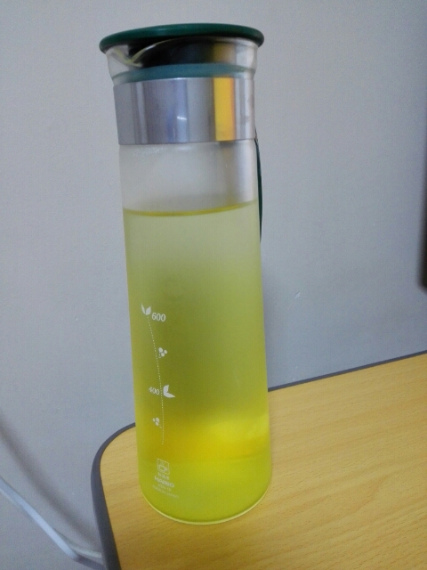昨日のノートに書けていなかったんですが、HARIOの「水出し茶ポット」を買いました。昨日の晩に仕掛けて作ってみました(写真)が、お茶の風味が薄めでした。もうちょっと濃い方が好みなので、次回は2パック入れて作ってみようと思います。うまくできたら会社にも作って持って行きたいです。