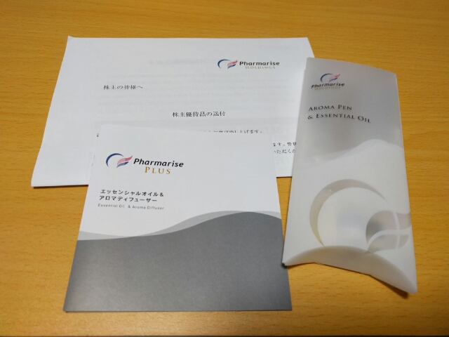 ファーマライズホールディングスから株主優待が届きました(写真)。アロマペンとエッセンシャルオイルです。医療用サプリメントがもらえると思って株を買ったら、今年は優待内容が変わってしまってたんですよね。うーん、手放そうか迷いますね。