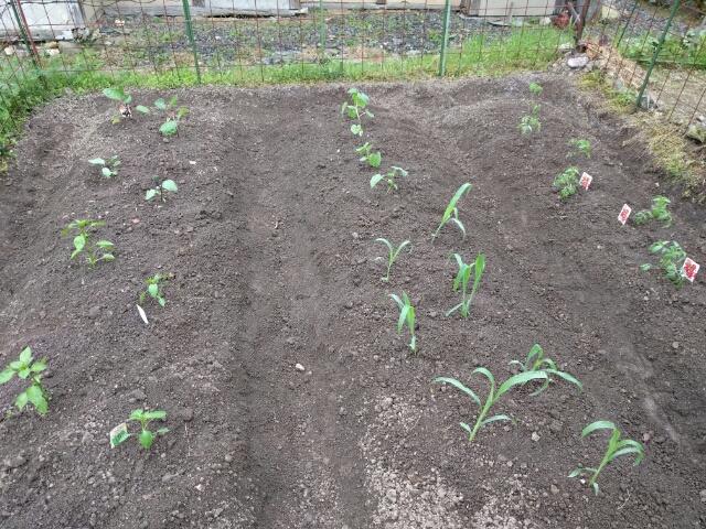 昼から野菜の苗を買いに行って、夕方に畑に植えました(写真)。キュウリとトマトとナスとピーマンとトウモロコシと遊びで明日葉を植えました。明日葉は天ぷらかお浸しが美味しいらしいですが、どんな感じになるんでしょうか。別の畑にカボチャも植えていますが、こちらは割りと放っておいても成長するので楽です。