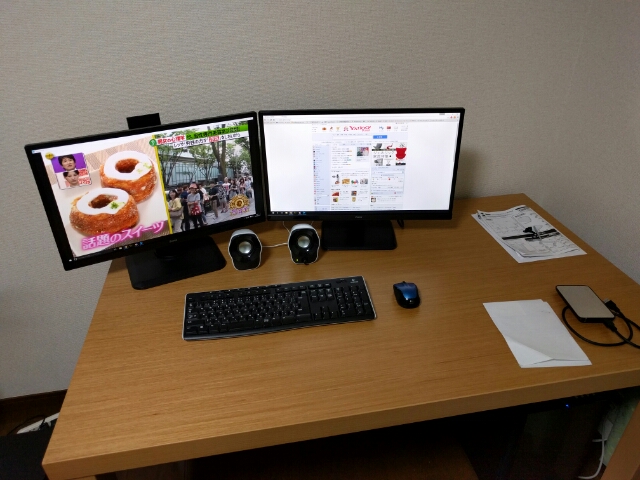 パソコンデスクを使い始めて少し経ちましたが、想像よりも快適です。晩飯もこのデスクで食べてるんですけど、広いので特に気になるようなことはありません。元がダイニングテーブルなので結構頑丈ですし、やっぱり広いっていいなというのが率直な感想ですね。