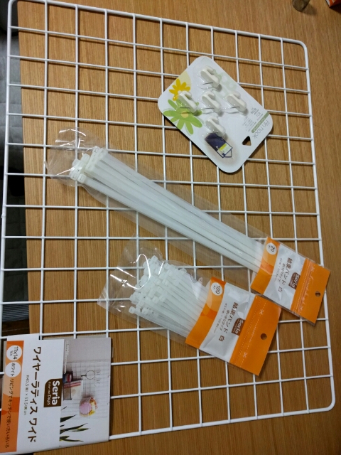 Seriaでワイヤーネット諸々を買いました写真。パソコンデスクの下のケーブル類が床に転がっていて足を伸ばしたら当たるうえに、掃除をするとき面倒なのでまとめてみようと思います。今日は買っただけなんですけどね。次の週末あたりにできたらいいな。