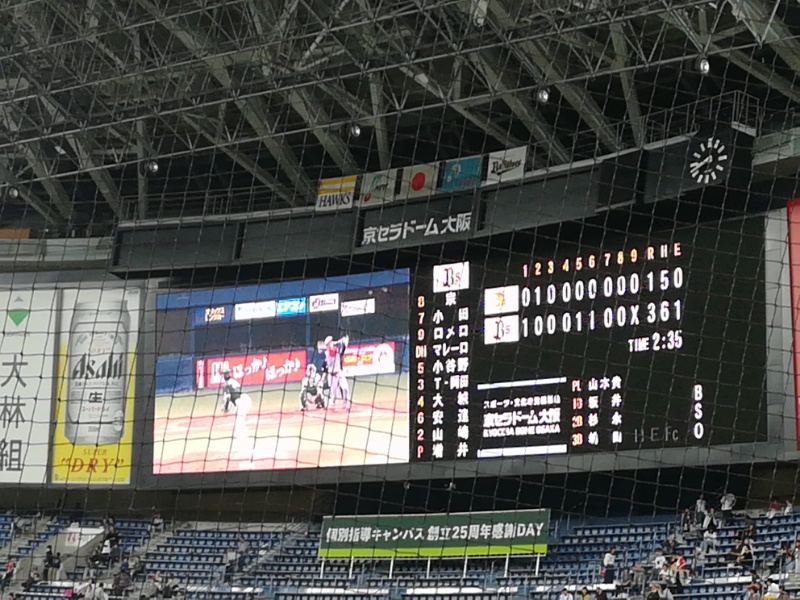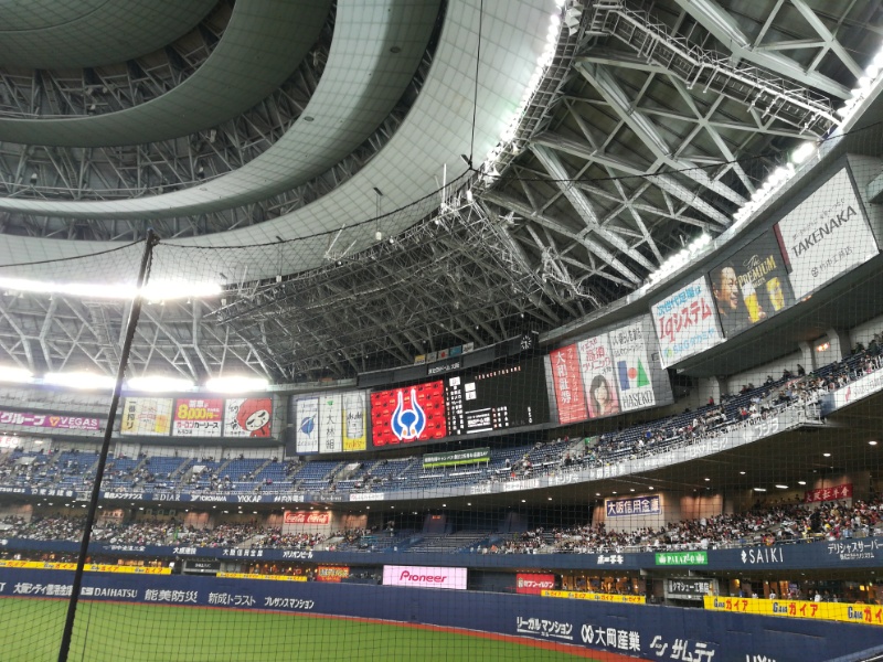 連休初日の今日は会社の先輩と野球観戦に京セラドーム大阪へ。オリックスvsソフトバンクのナイターゲームです。この三連戦はKANSAI CLASSIC 2018と題して、近鉄と南海の復刻ユニホームを着てプレイします。南海はもちろんのこと、近鉄も見覚えのないユニホームでしたが、往年のファンにはたまらない演出だったんでしょうね(写真)。結果はオリックスが3-1で勝ちました(写真)。これまで応援しているチームが5連敗と1引分だったので、久しぶりの勝利でした。調べてみると約4年ぶりでしたね。宗が攻守で活躍しましたし、西のコントロールが冴えわたっていましたし、中継ぎの山本も将来が期待できるピッチングでしたし、増井も無事抑えてくれましたし、楽しいゲームでした。