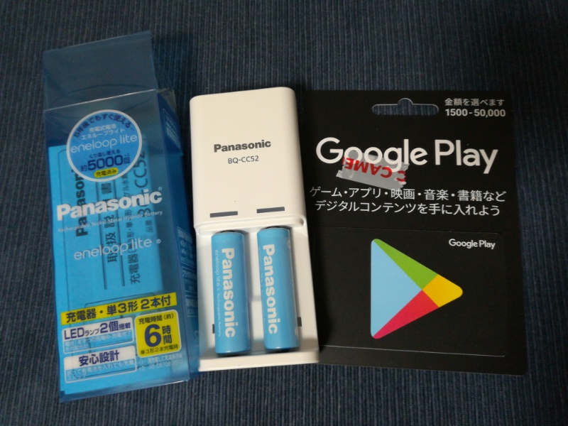 ビックカメラの株主優待券の期限が今月末に迫っていたので、eneloop liteとGoogle Playカードを購入しました(写真)。eneloopを買うのは初めてです。エチケットカッターとワイヤレスマウスで使いますが、liteで問題ないはずです。Google Playカードは金額を指定できるタイプのもので、合計で3000円になるように指定しました。優待券はおつりが出ないので、無駄なく使うにはこの買い方になります。