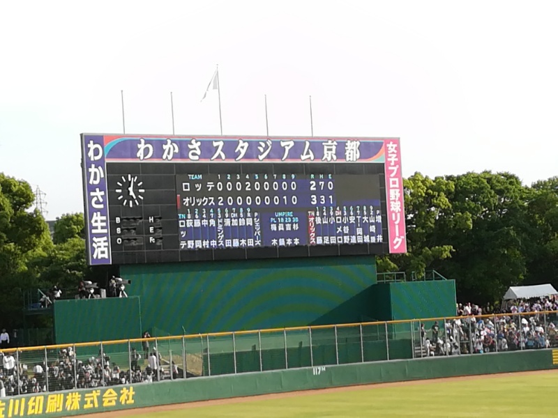 今日は会社の先輩・後輩と一緒にわかさスタジアム京都までオリックスvsロッテ戦を観戦に行ってきました(写真)。オリックスの地方球場主催試合でしたが、今回は三塁側での観戦でした。結果としては吉田正尚のホームランとタイムリーでオリックスが3-2で勝利しました(写真)。試合終わりのヒーローインタビューは吉田正尚と山本由伸の両選手でした(写真)。山本は勝ち投手になったのでヒーローインタビューを受けていたみたいですが、ヒット1本出したものの、1回を1奪三振でしっかりと抑えてくれました。防御率も1.20とかなりいい数字ですし、今後も期待です。
