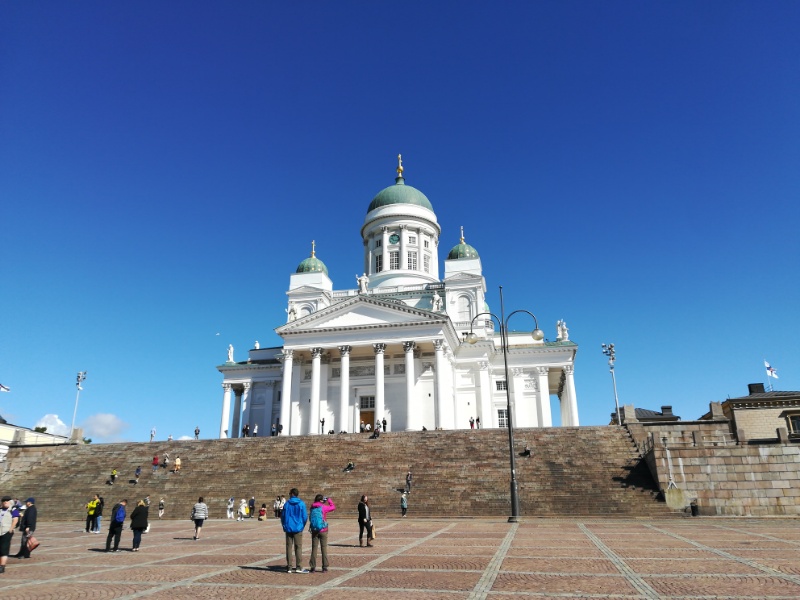 今朝はゆっくりして、昼前から観光に出かけました。今日はすごく天気がよく青空に白いヘルシンキ大聖堂(写真)が映えていました。今日が夏至祭でフィンランド人は夏至祭が開かれている地方へ出かけてしまっているらしく、人もまばらで開いている施設・お店も少ないという状況でした。そのため、公園に行ったり、街並みを歩いたりして過ごしました。