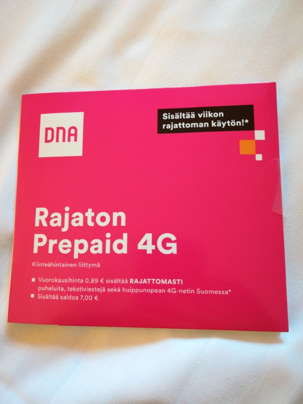 フィンランドでも現地のsimカードをスマホに挿して使っています。DNAのRajaton Prepaid(写真)というsimなんですが、これがすごいんです。3.9ユーロ(7.9ユーロがキャンペーンで半額!)で4G通信が7日間使い放題(1日0.89ユーロ定額、予め7ユーロ分クレジット済)。速度もかなり出ていて、ホテルのWi-Fiよりも快適です。北欧はモバイル先進国と言われますが、こんなに便利だったとは。