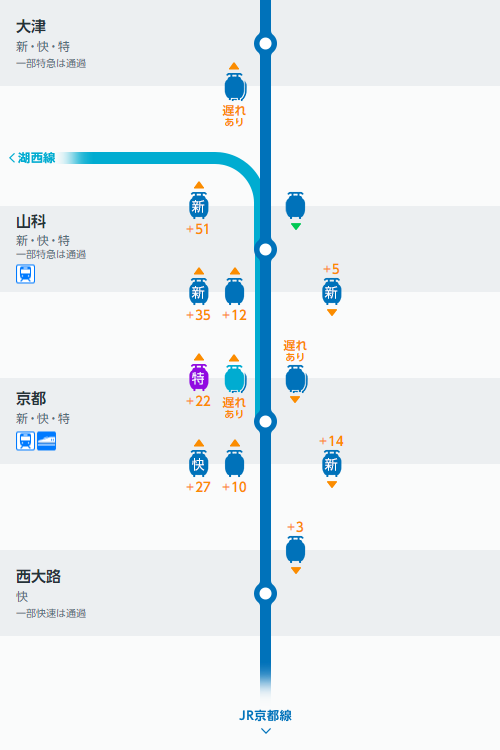 今朝は京都駅の信号トラブルの影響で、琵琶湖線、湖西線、JR京都線、JR神戸線、山陽線、赤穂線が遅れるという大変なことになっていましたね(午前8時30分の列車走行位置スクリーンショット)。昼から出張先に移動だったので、それまでに遅れが解消しているかひやひやしていましたが、なんとか遅れたなりに現場に着くことができました。
