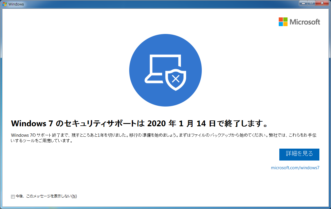 録画用パソコンのWindowsアップデートを適用するとWindows 7のサポート終了が近づいているお知らせが表示されました(スクリーンショット)。残すところあと1年を切りました、と書かれていますが、あと1ヶ月です。間違いではないですが、結構いい加減ですね。