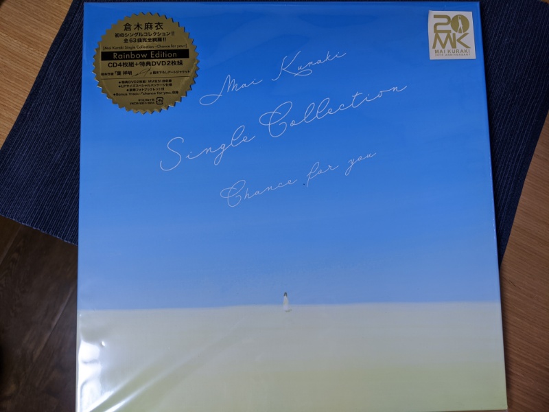 倉木麻衣の20周年記念のシングルコレクション「Mai Kuraki Single Collection 〜Chance for you〜」が届きました。めっちゃでかい。そして重い。気になって量ってみると1863gありました。CD4枚組とDVD2枚組(MV収録)です。ブックレットは歌詞カードだったんですが、これもアホみたいにでかい。これは聞き応え見応えがありますね。