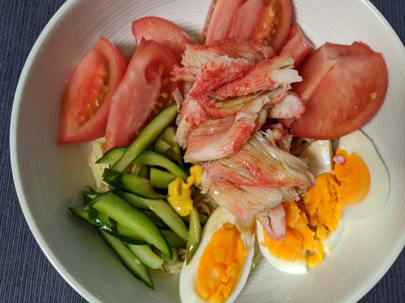 今年も冷やし中華はじめました。キュウリは浅漬けのものを千切りにして、トマトは8等分、卵は焼くのは面倒なので茹で卵を縦に4等分、あとはカニカマにしました。明日はカニカマをツナ缶に変えて食べます。