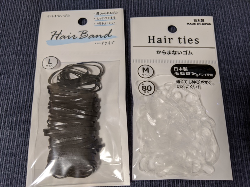 セリアでからまないゴムを購入しました。ヘアゴムなんですが、USBケーブルをまとめるために購入しました。ワイヤーホルダーでまとめていたものが、かなりスッキリまとまりました。モビロンバンドはボードゲーム界隈では箱の蓋をとめておくものとして有名みたいです。80本入りなので、買い増しは必要なさそうです。