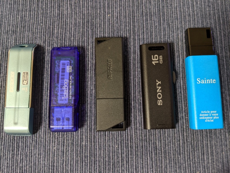 現在、USBメモリを5つ持っています(写真)。左から2GB(USB 2.0)、4GB(USB 2.0)、8GB(USB 2.0)、16GB(USB 2.0)、32GB(USB 3.0)です。容量が倍々で増えていっています(笑)大学の時に買ったものもありますが、まだ使えていますね。今から買うなら絶対USB 3.0以上ですよね。