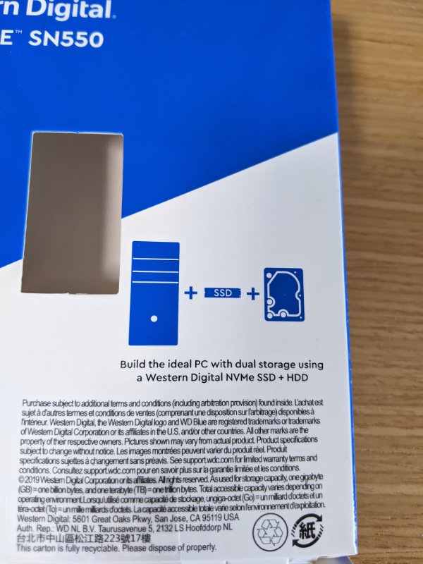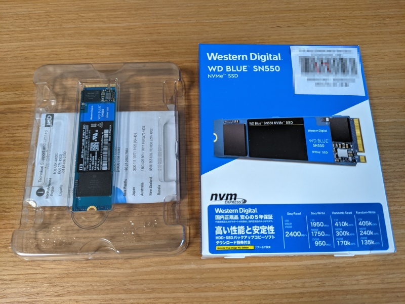 先週京都に出たときにWestern DigitalのM.2 NVMe SSD「WD Blue SN550 NVMe」を購入していました。メインPCのCドライブで使用しているWD Blue SN500 NVMeの後継モデルです。メインPCのストレージ増強が目的です。無事取り付け完了し、フォーマットして認識されました。箱の裏には、WDのNVMe SSDとHDDを使用して理想的なデュアルストレージPCを構築してくれとメッセージがありましたが、M.2 NVMe SSDでダブルストレージにしてやりました(笑)