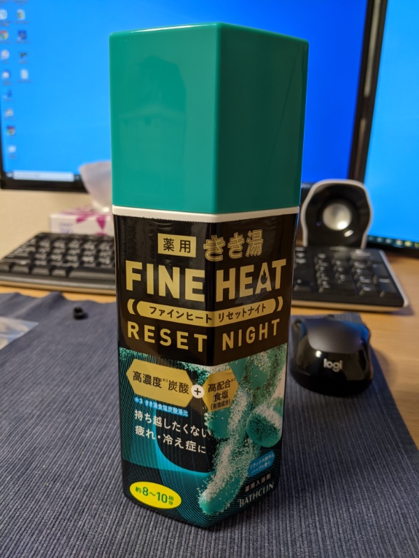きき湯ファインヒート リセットナイトを購入しました。普段は通常のきき湯(食塩炭酸湯)を使っているんですが、ファインヒートの方が風呂上がりのポカポカが長く続きます。1回あたり70円するのでちょっとした贅沢ですね。