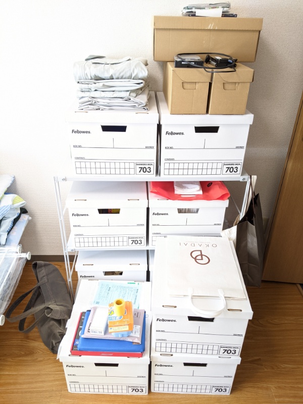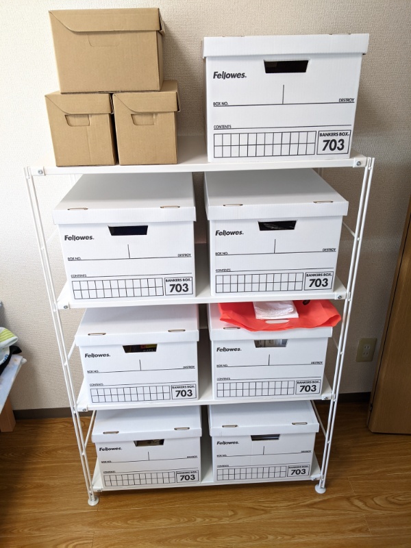 押し入れの中に入れたユニットシェルフの収納を少し変えました。ポリプロピレン収納から余っていたバンカーズボックスに移しました。湿度と防虫には注意が必要ですが、衣替えするときにしか開けないので段ボールでちょうどいいです。