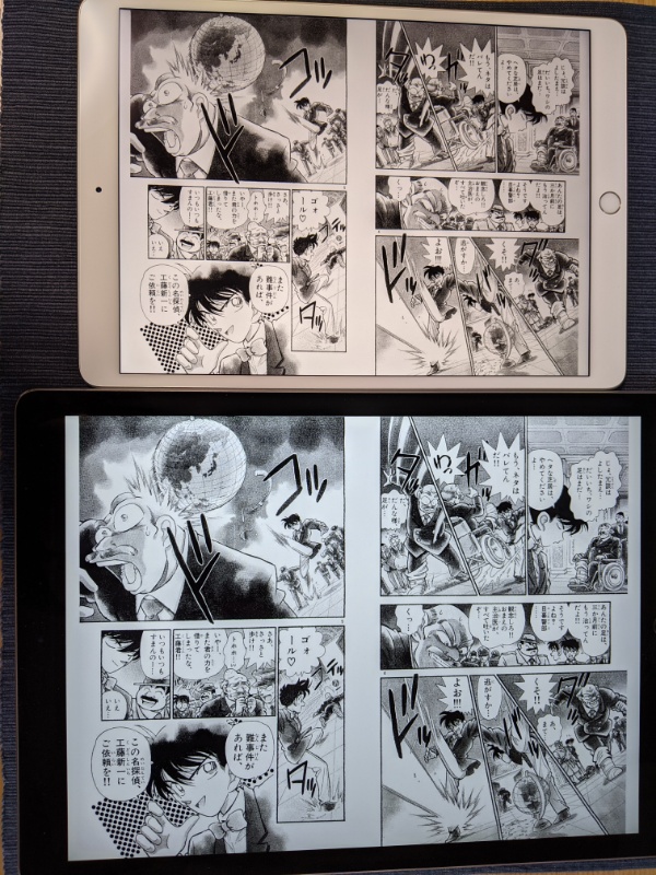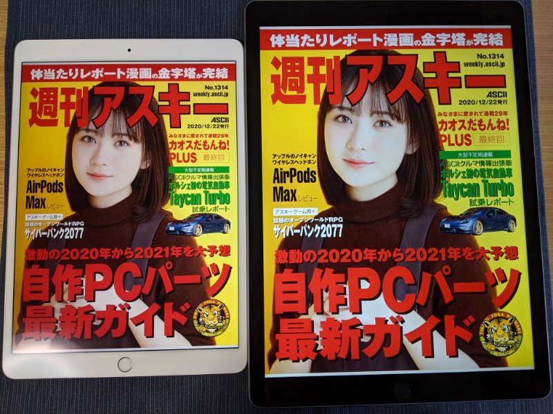 購入してから2週間が経ってしまいましたが、iPad Pro(第1世代,12.9インチ)からiPad Air 3に乗り換えました。両方を持ってみるとその重さの違いがよくわかります。実測245gの差は大きいですね。雑誌の表紙とマンガの見開きを比べてみたところ、確かに画面サイズが12.9インチから10.5インチにサイズダウンしたため文字が小さくなりましたが、読むのに問題はありませんでした。4年前に大きさは正義ということで、12.9インチモデルを購入して、それはそれで見やすくて良かったですが、今は見やすさと軽さの両立ができて良かったと思っています。