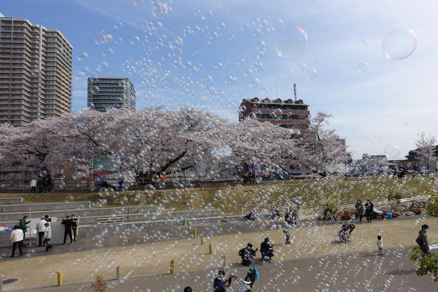先週末に引き続き旧草津川まで桜を見に行ってきました。八分咲きくらいでしたね(写真)(写真)。シャボン玉を飛ばしている人がいて子供たちには大人気で、大人からも歓声が上がっていました(写真)。