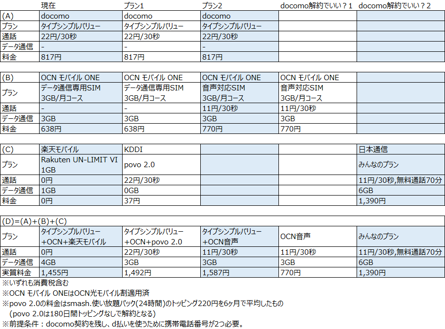 楽天モバイルの0円終了が決まったので携帯料金思案です。現在は月額1,455円で4GB、通話料無料で使用できているわけですが、楽天モバイル0円終了につき、楽天モバイルの移行先を検討しました。家族間通話無料を重視しdocomo契約は残し、d払いを使うためにdocomo契約以外の携帯電話番号が必要という状況では、楽天モバイルからpovo 2.0またはOCN モバイル ONEへMNPする案があります。povo案では月額1,492円〜で使えます。OCN案では月額1,587円〜となりますが、通話料は半額です。ただ、あまり電話することがないのでpovo案がいいかなと思っています。しかしながら家族間通話をLINEにしたらいいわけで、OCN単体プランだと月額770円〜、あるいは家族間もこちらから掛けること前提で日本通信みんなのプランだと月額1,390円〜となります。やはりキャリアから格安SIMへ完全移行が価格面では最適解ですね。