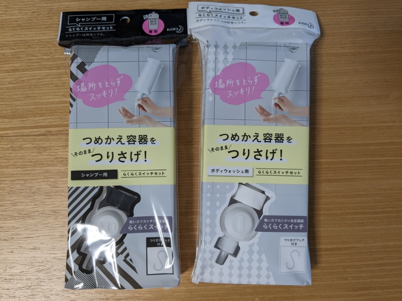花王のらくらくスイッチを購入しました。ぬめぬめしてくるのが嫌で、風呂上がりに詰替ボトルの水滴を拭き取って、洗面所に置いておくということをしていたんですが、このつりさげ式に変えて浴室に引っ掛けておくだけでぬめぬめが発生しないのか試してみます。