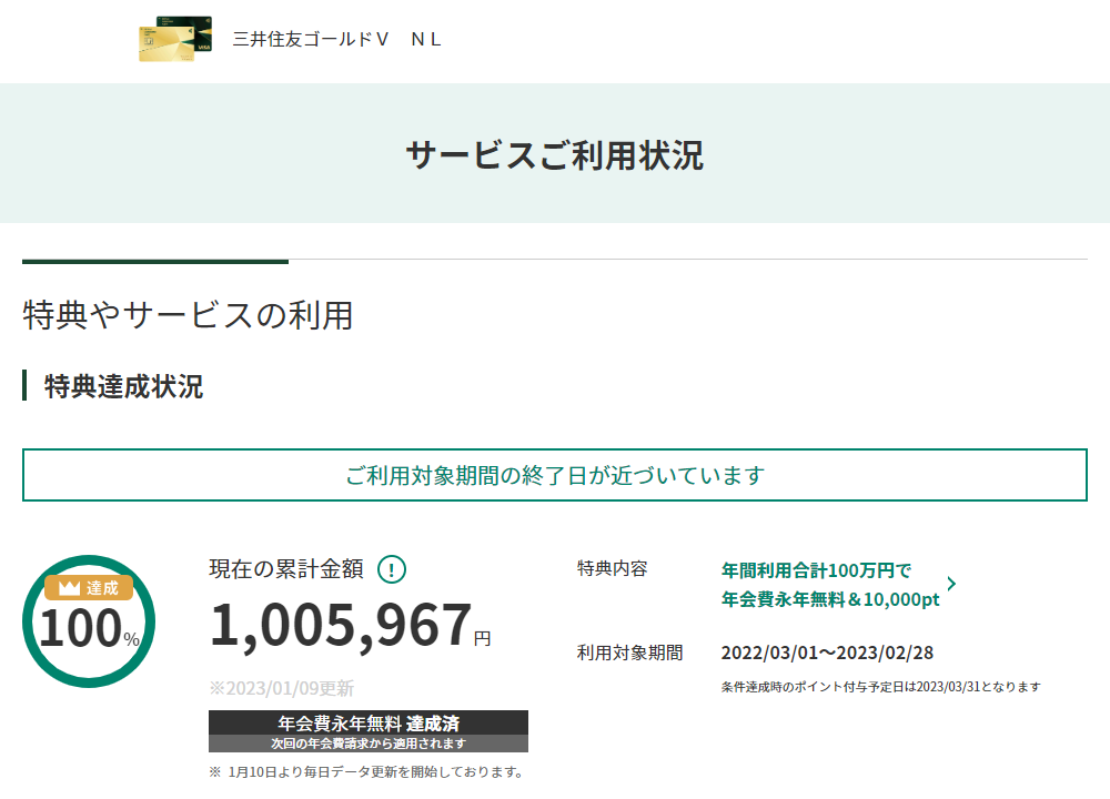 三井住友カード ゴールド(NL)の100万円修行を達成しました。23年2月までに100万円決済すると年会費が永年無料になるというものでしたが、余裕をもって達成することができました。今後はSBI証券でのクレカ積立専用カードにします。タッチ決済で5%還元の対象店舗に行くことがあれば使うかも。