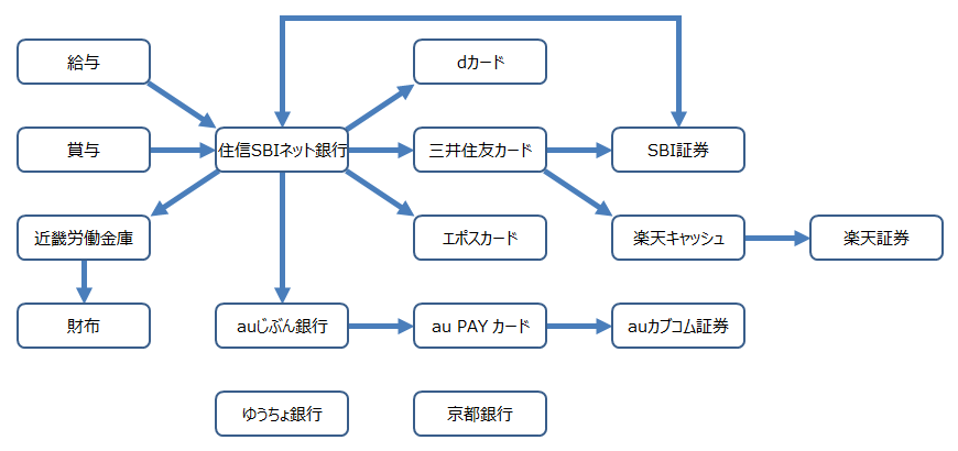 人事に給与賞与振込口座の変更届を出していたんですが受理されました。これまで近畿労金に振り込んでもらっていたのを住信SBIネット銀行に変更しました。今後はこんな感じのお金の流れで行こうと思います。近畿労金はATM手数料が返ってくるのでお金をおろすときに使います。カードの引き落とし口座を住信SBIネット銀行に基本的に集約しているので、住信SBIネット銀行で給与を受け取った方が安心できます。