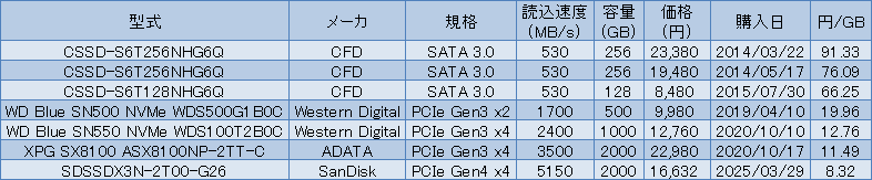 これまでSSDはいくつか購入していて今回が7個目のSSDなんですが、昔のことを思うと価格も安くなりました。一覧表(画像)にまとめてみましたが、2014年に256GBを23,380円で購入していたのが、今回は2TBが16,632円ですからね。