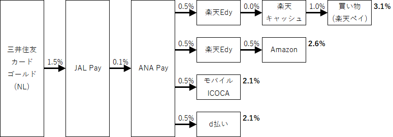 ポイント還元の改悪の流れは変わりません。先日dカードから“なんとかPay”へのチャージがポイント還元対象外になりましたが、このたびJAL PayからANA Payへチャージした際のポイント還元率が0.5%から0.1%に変更となりました。まぁチャージルートを残してくれていて、還元されるだけまだありがたいですね。11月からポイ活ルートはこんな感じになります(画像)。