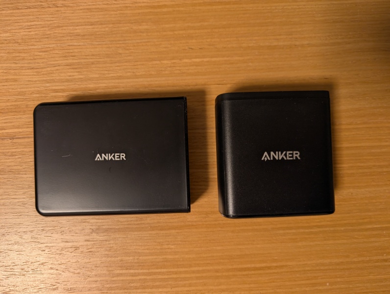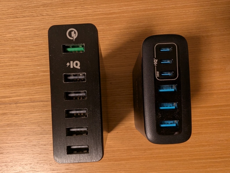 AmazonスマイルSALEで20%OFFになっていたのでAnkerの6ポート充電器を買いました。今使っているものが2016年6月に購入したもので買い換えです(写真1)(写真2)。Type-A×6ポート 60WからType-C×3ポート+Type-A×3ポート 112Wになったので充電速度が改善されます。2016年は12W充電でも充分だったんでしょうけどね。eneloopの充電器だけmicro USB(Type-A to micro USB Type-Bケーブル)で、Fitbit Inspire 3の専用充電ケーブルがType-AなのでType-Aポートはまだ必要です。そんなに同時に充電することはないんですが、充電するときにケーブルを挿すだけの状態にしておきたいので多ポート充電器を置いています。