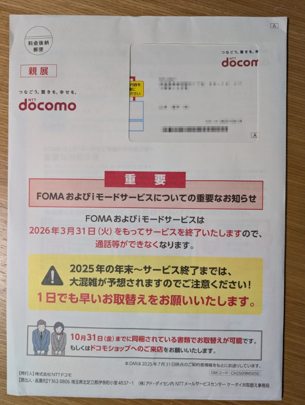 NTTドコモからFOMAおよびiモードサービスについての重要なお知らせが届きました(写真)。これまでのお知らせはフチが圧着されているタイプのDMで届いていましたが、サービス終了まで半年となって初めて封筒で届きました。気合が入ってきましたね。書面を郵送して申し込み宅配便で機種が届くということができるみたいですが、契約事務手数料4,950円は掛かるそうです。
