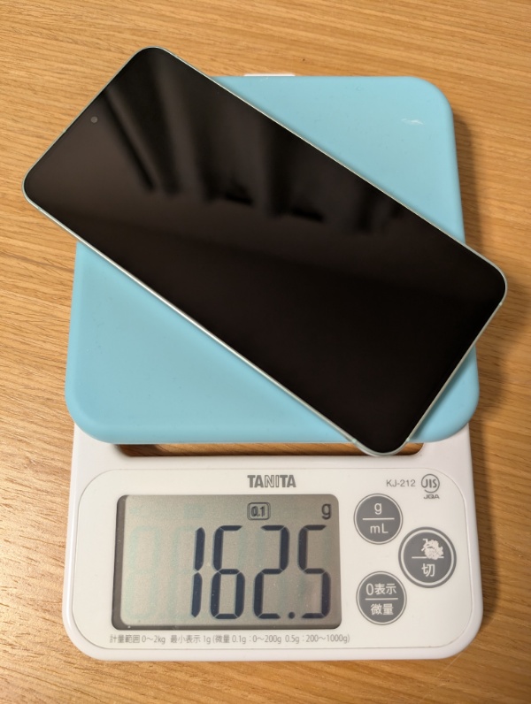 Galaxy S25が届きました(写真)。端末カラーはミントにしました(写真)。Amazonで最後まで在庫が残っていて人気がない色みたいですが、いい色だと思います。質量は実測162.5gとかなり軽いです(写真)。Pixel 8よりも24gも軽いのでさすがに持ったらわかりますね。