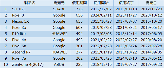 Google Pixel 8のメインスマホとしての使用期間がGoogle Nexus 5Xを抜いて歴代2位になりました(画像)。Nexus 5Xは故障しなければ使い続けたかったです。そう考えるとPixel 8は比較的安定して使えていますね。まとまった時間が取れずGalaxy S25への移行ができていないのでもう少し記録は伸びる予定です。