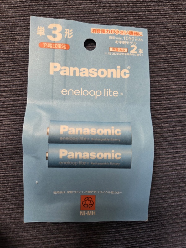 ビックカメラ.comで入浴剤(ツムラのくすり湯 バスハーブ。冬場は特におすすめです。)とeneloop liteを買いました。株主優待券を使うために、必要事項を記入した書類と株主優待券も本日郵送しました。特定記録郵便で送る必要があって320円必要なんですが、最寄りのビックカメラが高槻なので通販で使うことにしています。eneloop liteは2025年7月製造のものでした(写真)(写真)。日本製です。今使っているeneloop liteは中国製時代のもので容量も100mAh少ない950mAhです。調子の悪い物が出てきたので置き換えです。自宅と会社でワイヤレスマウスに使います。重量が軽くてマウス向きだと思っています。過放電が寿命に響くのでこまめに継ぎ足し充電をしたいところです。