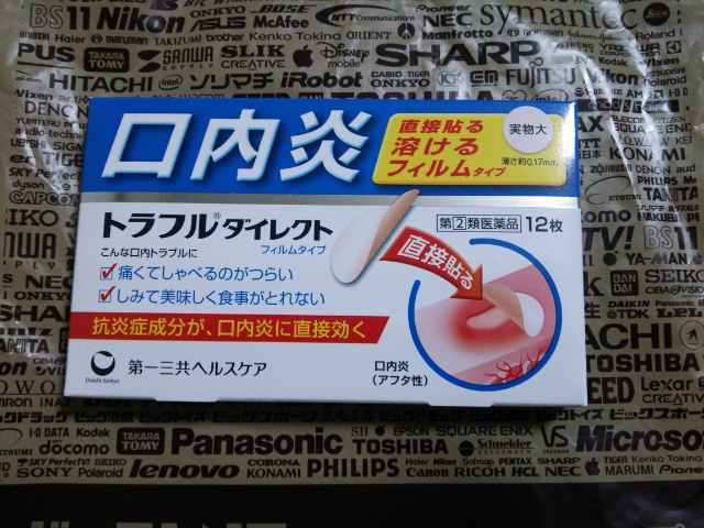 口内炎ができてしまって、なかなか治らないので「トラフル ダイレクト」を買いました。錠剤タイプの「トラフル錠」は呑んだことことがあるんですけど、早く治したいので貼るタイプです。原因は歯科矯正の金具だと思うんですけどね。ストレスの線もわずかに?