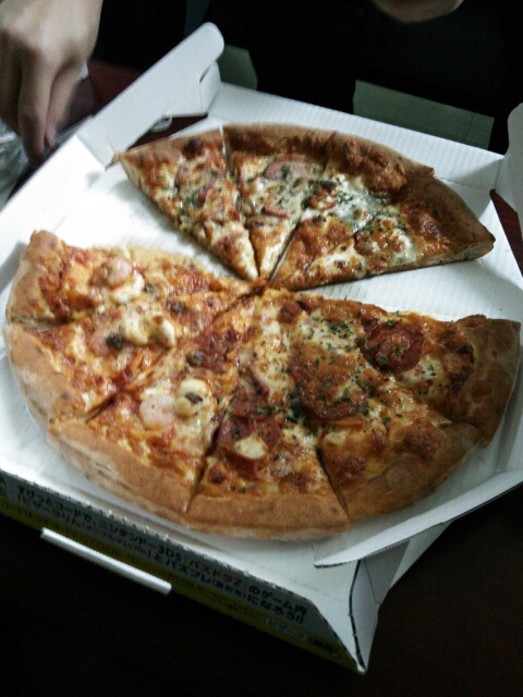 少しでもクリスマス気分をということで、社員寮の先輩がピザを頼んだので、少し頂いてきました。美味しかったんですが…。晩飯+ピザでリアル腹パンパン(©ベテラン)…。