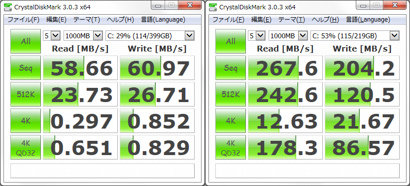 実際に使ってみると、起動とシャットダウンの体感速度が断然速いし、気になっていたIEの起動もスムーズでした。で、ベンチマークを取ってみたんですが、確かに速度が向上していました。ノートパソコンの規格がSATA2接続なので本領発揮はできていないんですけどね。奮発して256GBのSSDを買ったので、費用は総額23379円(ポイント還元含む)でした。自分の使い方だと少なくとも後2年は容量も速度も気にせずに使っていけるかなと思います。