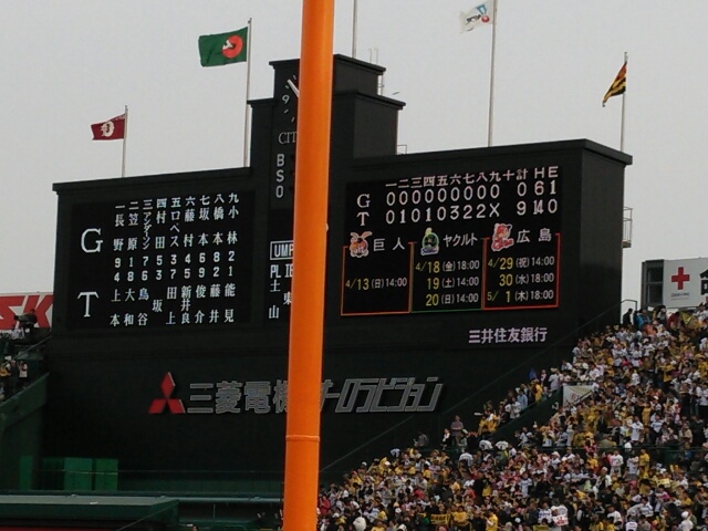 会社の先輩たちと甲子園に阪神巨人戦の観戦に行ってきました。打っては新井良太とマートンがホームラン、投げては能見が完封勝利、終わってみれば9-0の快勝でした!観に行った試合で勝利するとすごい盛り上がるし、楽しいですね。