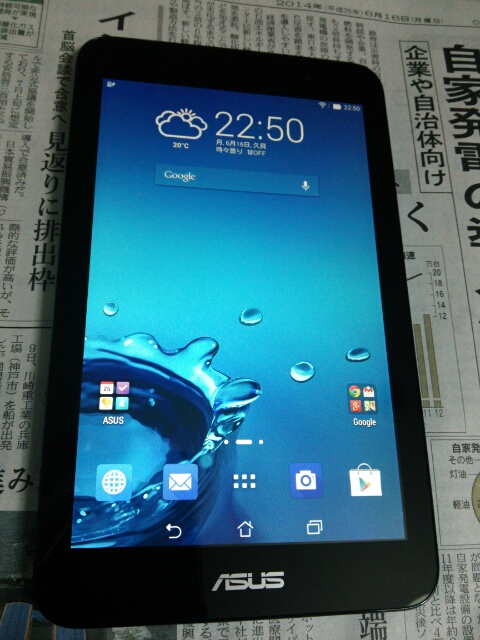 「ASUS MeMO Pad 7」買いました!10インチのタブレットにするか迷ったんですが、通勤時間が長いので電車の中でも使うことを考えて7インチのMeMO Pad 7にしました。スマホのことを思うと画面が大きくて見やすいですね。今日は初期設定とソフトウェアアップデートで終わったので、明日からいろいろいじっていこうと思います。