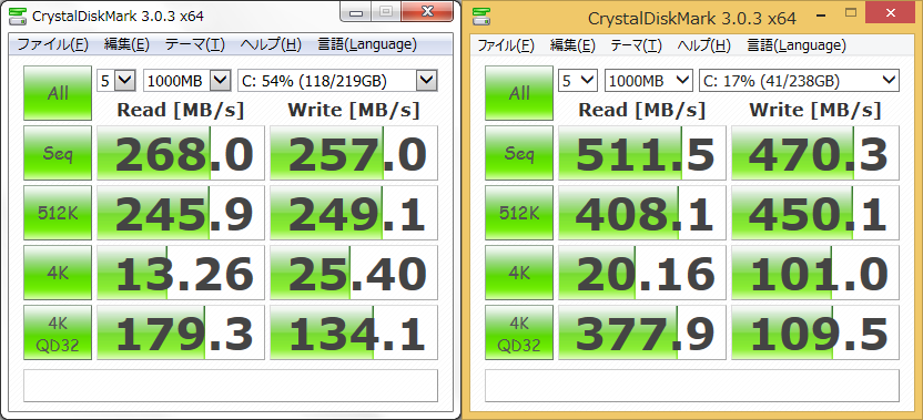 CrystalDiskMarkを走らせてみました。ノートパソコンはSSDをSATA2.0でつないでいたんですが、自作のデスクトップではSATA3.0でつなげています。使っているSSDはSATA3.0対応のものなんですが、デスクトップでは本来の性能が出せている分だけ速くなりました。でも体感ではその差がわかりません(笑)