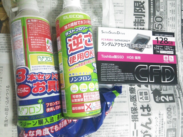 寮の管理人さんのパソコンを修理することになったわけですが、SSDがエラーを吐いているので、新しいSSD(+エアダスター)を用意しました。性能と安定性を見てCFD(東芝製)のものにしたんですが、SSDもだんだん安くなってきていますね。それからホコリがひどかったのでエアダスターでの掃除をお願いしておきました。作業はクローンコピーで何とかなると踏んでいますが、果たして…。