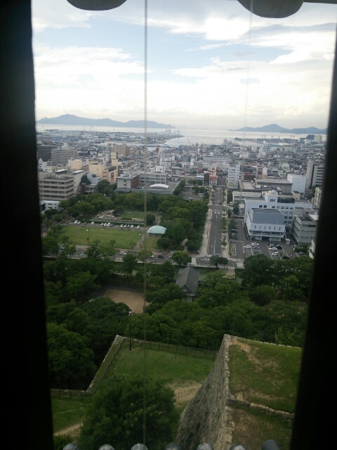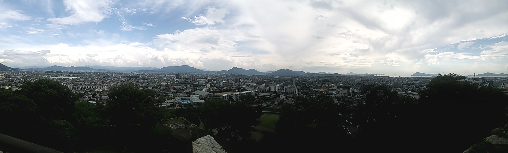 初日は丸亀城に行きました。天守からの眺めもよく、記念スタンプに書かれているように、扇状の石垣が特徴のようです。上からの景色をパノラマで撮ってみました。