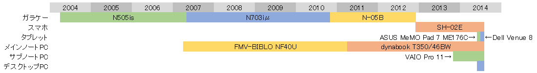 端末遍歴を作ってみました。ガラケーはNEC(NECカシオ)にこだわってたんですよね。N703iμの薄さはよかったですね。デスクトップPCに取って代わられて、メインノートPCを全くと言っていいほど使わなくなっているので、どうにか処遇を考えたいところです。