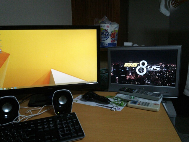 今後としては[1]レコーダー経由でテレビを見る、[2]パソコンとテレビをつないでパソコンの地デジチューナー経由でテレビを見る、この2つですね。レコーダーとパソコンだったらパソコンを立ち上げる方が楽なので、テレビとパソコンをVGAケーブルでつなげて、デュアルディスプレイにしてみます。そして、テレビ画面に地デジプレーヤーを出力してやればテレビとして機能するはず…。